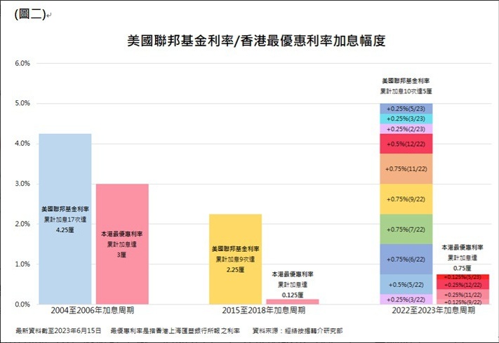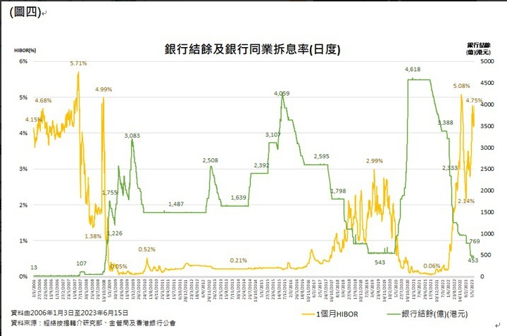曹德明预计,年内美国仍会加息以降低通胀,港美息差或将进一步扩大,拆息仍会继续维持高水平。香港6月15日一个月拆息(HIBOR)报4.75%,已连升7个工作日,并且逾一个月处于4%以上水平,预计HIBOR短期内将挑战5%水平(图四)。在资金成本压力续增下,银行仍有追加最优惠利率(P)的压力,不排除有个别银行根据自身资金成本而追加P,幅度约0.125%左右。