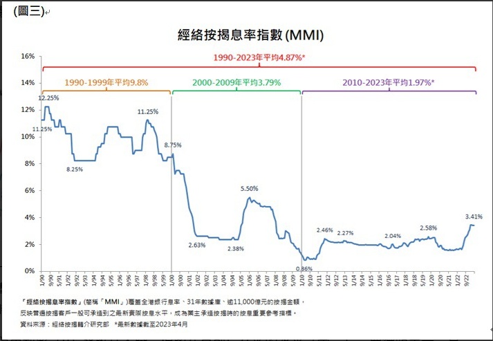 曹德明提到,本次汇丰银行宣布最优惠利率(P)维持不变,相信是根据自身资金状况以及公司策略等因素而作出此决定。而现时市场普遍新造H按计划的封顶息率保持约3.5%,对比经络按揭逾32年的平均按揭息率指数(MMI)4.87%,息率属正常水平(图三)。