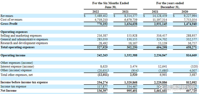 2020-2021年,公司营收分别为922.80万美元、1412.85万美元,同比增速达53%,相应的净利润分别为60.77万美元、166.19万美元;而在2021年、2022年的前6个月,公司营收分别为831.44万美元和548.94万美元,净利润分别为99.54万美元和13.64万美元。