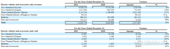 从萝贝智能的产品收入结构来看,2021年全年,公司电动两轮自行车收入为603万美元,电动两轮摩托车收入为132万美元,电动三轮车收入为411万美元,三者在收入占比中占超九成。其余如四轮电动越野车、电池等产品收入规模较小,可忽略不计。