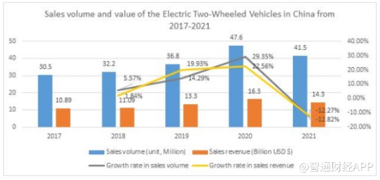 将视角放宽到行业层面,萝贝电动两轮车的下滑与行业整体趋势相符合:据中国电动车协会数据,2021年中国电动两轮车的总销售收入与销量均明显下跌,录得约12%的同比跌幅。