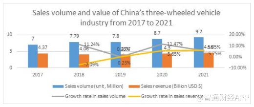 从市场层面来看,2017-2021年间,中国三轮电动车的销售额与销量双双稳步增长,2017年三轮车的销售额约为43.7亿美元,2021年为46.7亿美元,年复合增长率约为1.17%;销量从2017年的700万辆增加到2021年的821万辆,复合年增长率约为3.2%。与此同时,随着电动化趋势日益流行,燃油发动机三轮车从2017年30%的市场份额下降到2021年的12%。