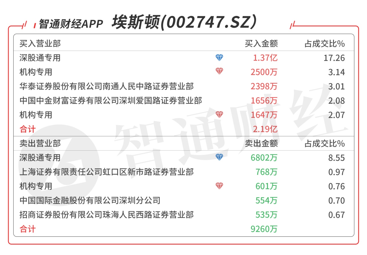 埃斯顿(002747.SZ):受到众多机构青睐,今日共3个机构席位出现在龙虎榜单上,对倒合计净买入3309万元,深股通大单对倒买入6927万元,当日净买入1.24亿元,该股今日突破所有均线,预计压力位在前期高点附近。