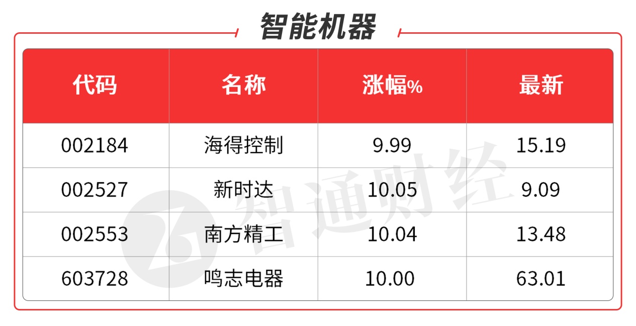 智能机器板块强势崛起,中大力德(002896.SZ)2连板,江苏雷利(300660.SZ)、通力科技(301255.SZ)、恒而达(300946.SZ)均获20CM涨停;海得控制(002184.SZ)、新时达(002527.SZ)创今年以来的新高,埃斯顿(002747.SZ)等10余股涨停;机器人方向今日大涨,与当前火热的AI方向有些许关联,观察上涨的持续性。