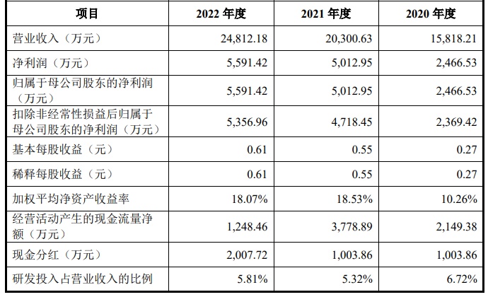 财务方面,于2020年度、2021年度以及2022年度,该公司实现营业收入分别约为1.58亿元、2.03亿元、2.48亿元人民币;同期,实现净利润分别约为2466.53万元、5012.95万元、5591.42万元人民币。