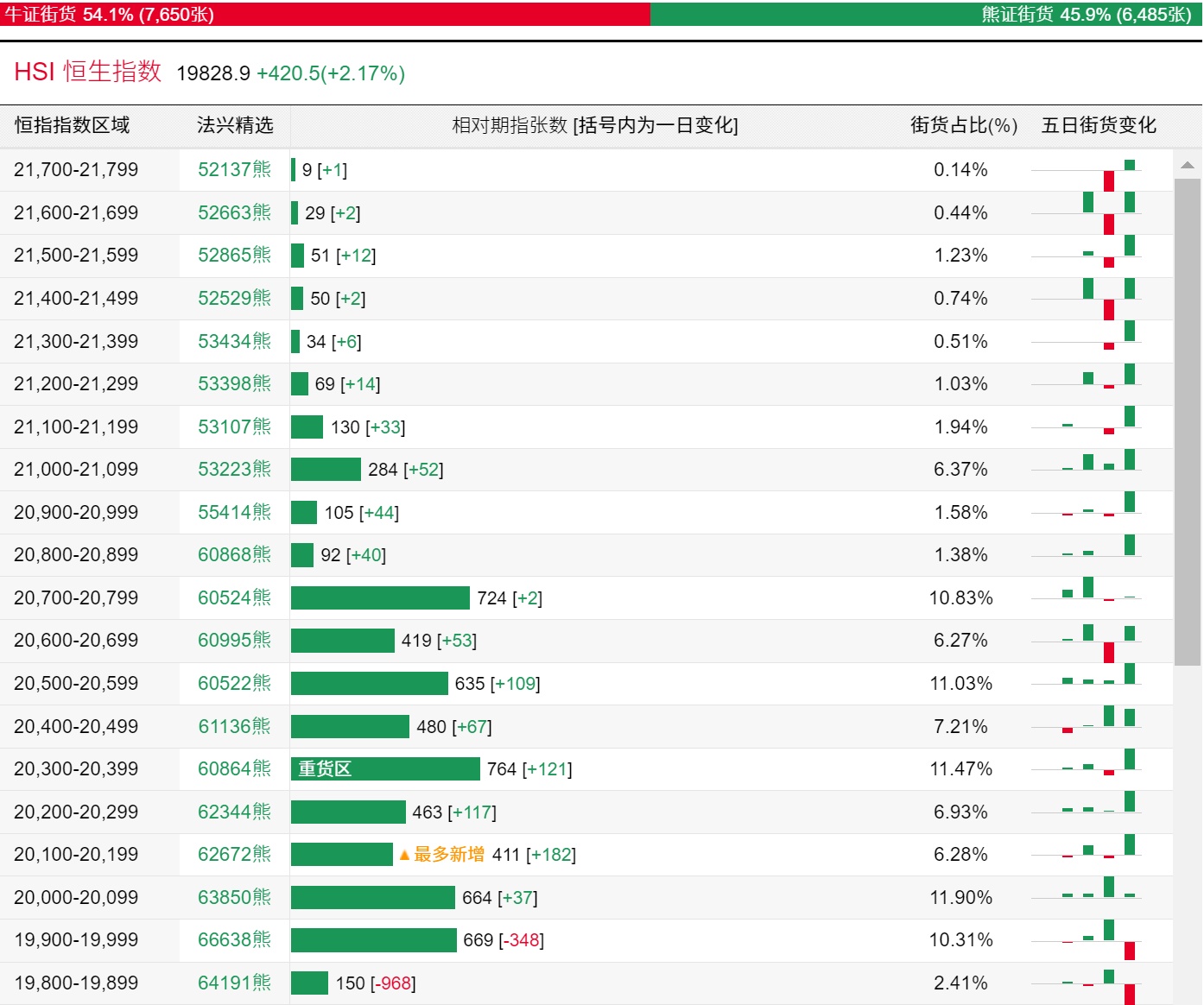 法兴恒指牛熊证街货分布图中的数据显示,熊证街货重货区在20300-20399区间,该区间最新熊证数量为764张,较上一交易日增加121张;最多新增在20100-20199区间,该区间最新熊证数量为411张,较上一交易日增加182张。