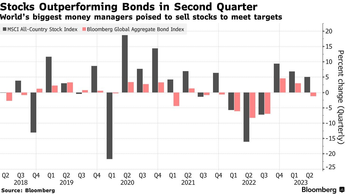 值得注意的是,养老基金和主权财富基金是投资界的支柱,它们通常会在每个季度重新调整其市场敞口,实现60%的股票和40%的债券或类似的敞口组合。本季度到目前为止,摩根士丹利资本国际(MSCI)的全球股票指数上涨了5%,而彭博全球债券指数下跌了1.3%。