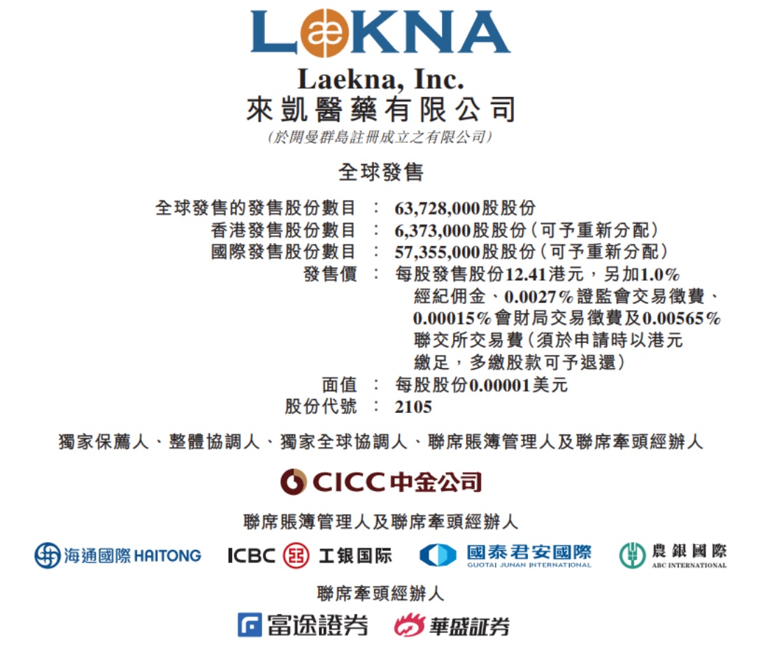 智通财经APP获悉,来凯医药今日(16日)起至21日招股,每股发售价为12.41港元,每手500股,入场费约6267.6元。全球发售股份数目为6372.8万股,其中,香港发售股份数目637.3万股,国际发售股份数目5735.5万股,来凯医药预期将于6月29日挂牌。中金为独家保荐人。
