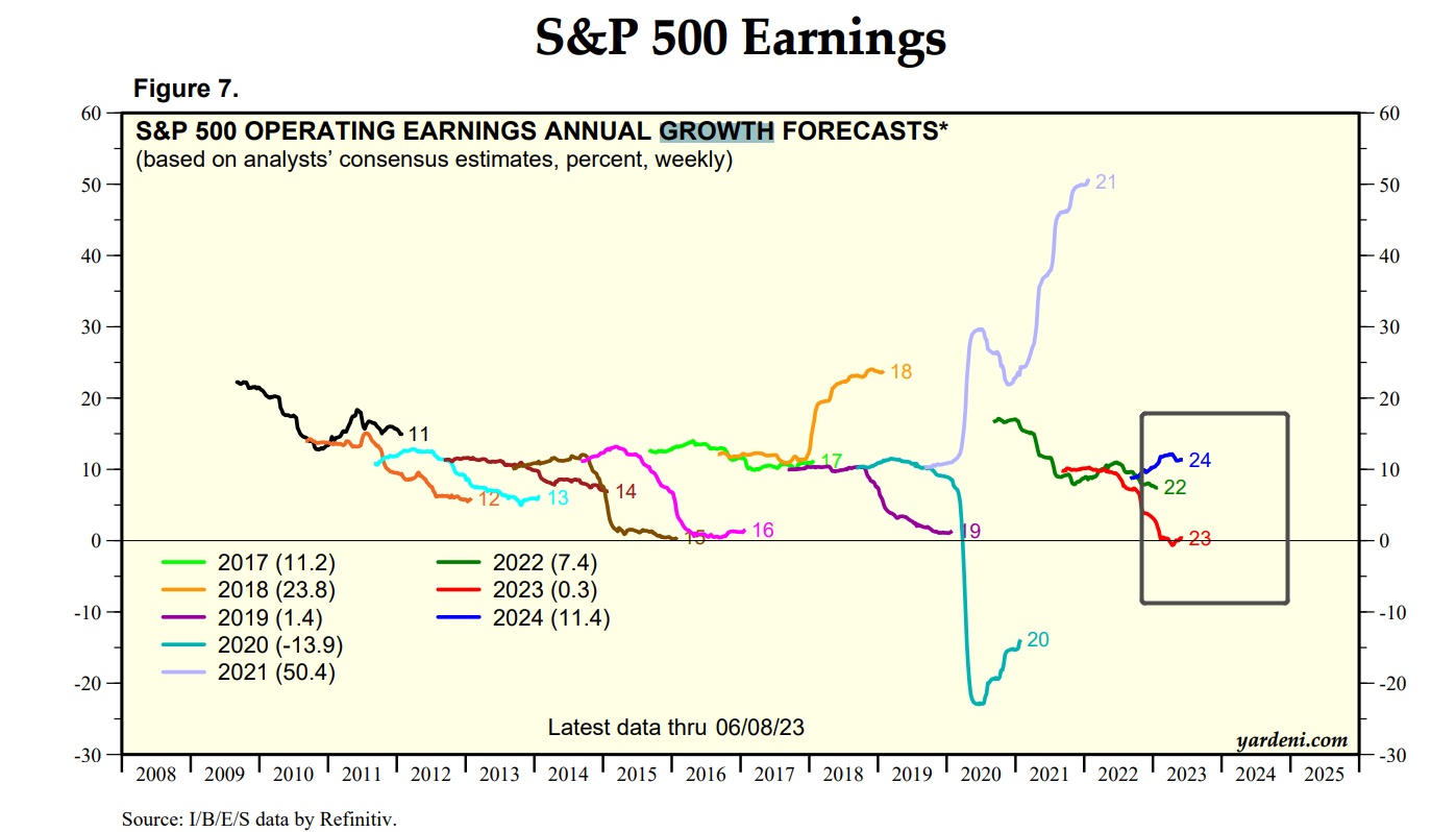 根据分析师的普遍预测水平,第一季度可能标志着企业盈利水平的阶段性低谷。分析师们普遍预计,从2022年底开始的利润收缩趋势预计将在今年第三季度左右结束,并预期在2024年恢复两位数级别的利润增长趋势。市场往往提前半年左右的时间定价趋势线,但是,一些美股市场的"看涨信仰者们”可能已开始为极度乐观的利润趋势做准备工作。
