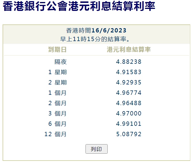 智通财经APP获悉,6月16日,美国暂停加息不阻港元拆息升势,港元拆息连续三日全线上升,其中,隔夜息进一步升至4.88238%,创四周新高,而与楼按相关的一个月拆息逼近5%,报4.96774%,连升8日,创近半年新高,较同期美元LIBOR低19基点。
