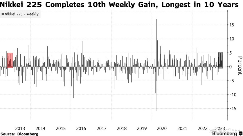 智通财经APP获悉,日经225指数连续第10周收高,创下自2013年2月以来最长的连续上涨记录,此前日本央行维持宽松的货币政策,导致日元走弱。
