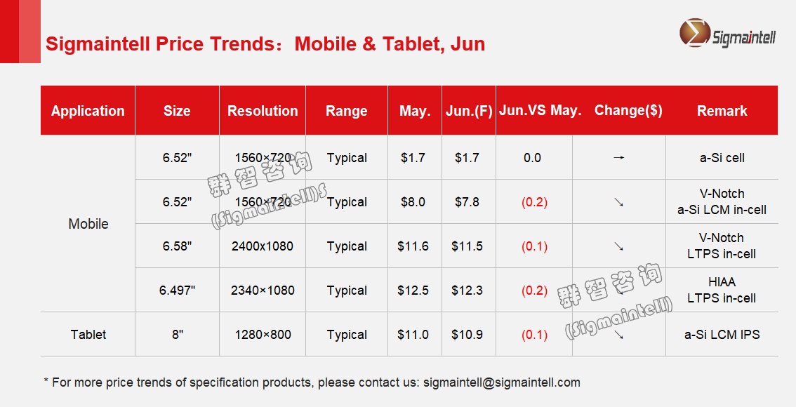 6月份,Tablet终端市场依然处于弱需求状态,供应链对通过价格策略刺激市场需求的策略保持谨慎,群智咨询(Sigmaintell)预计,Cell价格将逐渐趋于稳定,但模组价格依然处于下降通道。