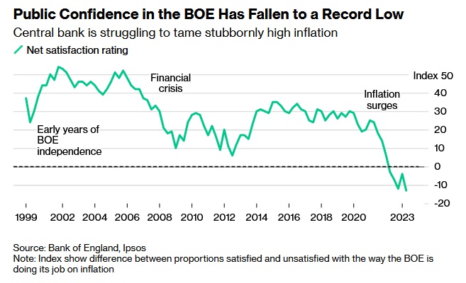此外,调查还显示,公众对英国央行的工作方式越来越不满。一项跟踪公众对英国央行满意度的指数从-3进一步降至-13,这是自1999年英国财政部将设定利率的权力移交给英国央行以来有记录的最低水平。