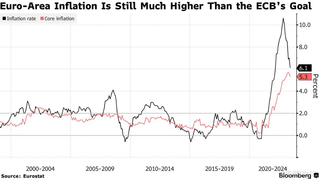 欧盟统计局的最新数据显示,5月份核心通胀率放缓至5.3%。然而,这仍然远高于2%的目标。总体通胀率更高,达到6.1%。