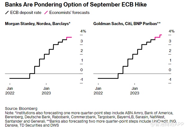 不过,目前的焦点是9月份的会议,拉加德对此守口如瓶。尽管多数分析师仍预计欧洲央行将在下个月加息后暂停加息,但市场几乎已经完全消化了此后的另一次加息——本周对季度通胀预测的小幅上调提振了这一预期。