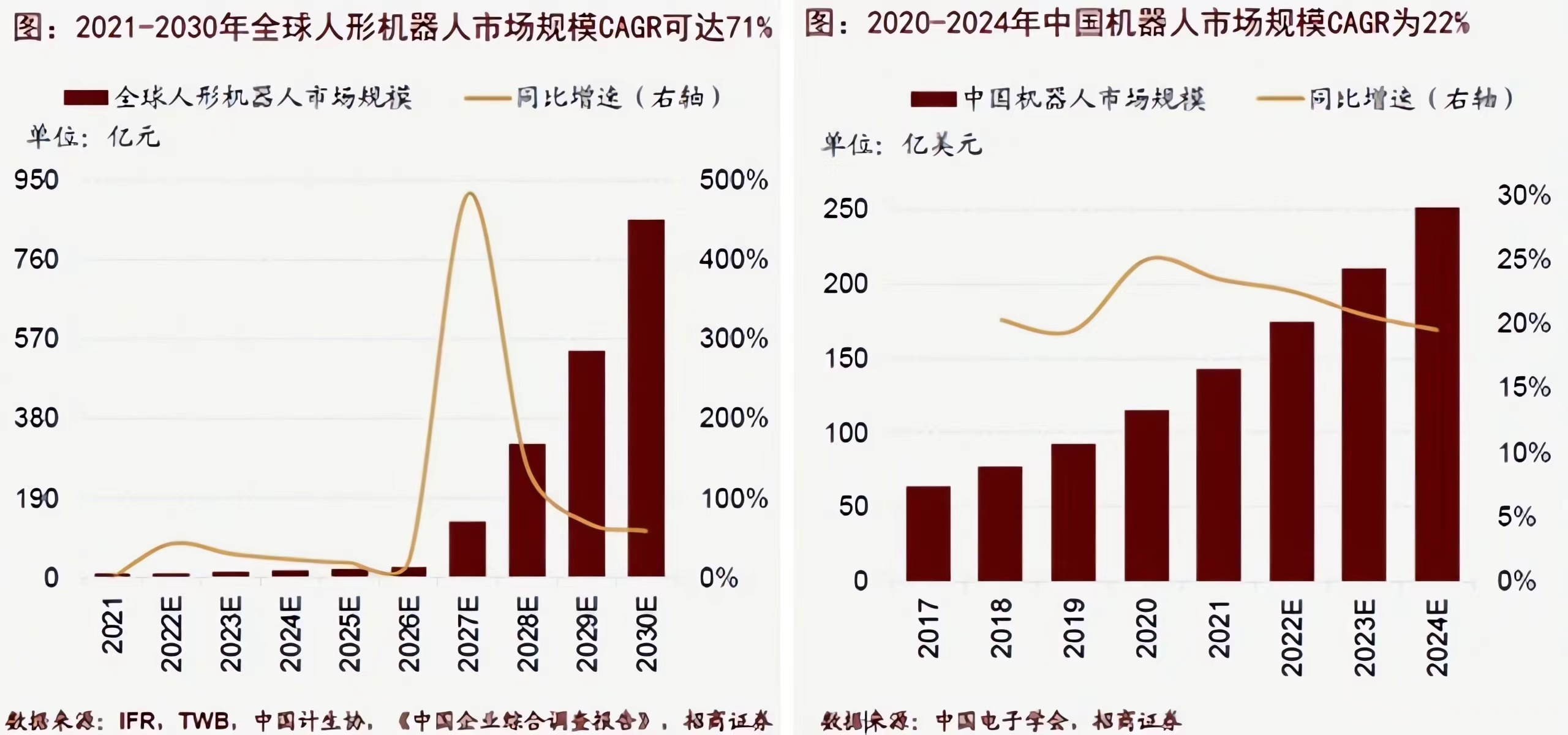 分析师指出,人形机器人有望持续印证“AI软切硬”逻辑,有望成为“AI+”终极应用。人形机器人需求潜力大,预计21-30年全球市场规模CAGR能达到71%。根据中国电子学会数据,国内机器人2024年有望达251亿美元市场规模,2020-2024年CAGR约22%。