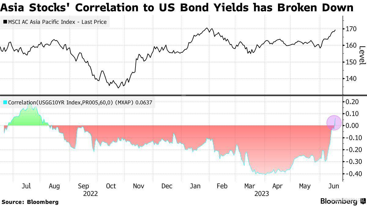 智通财经APP获悉,MSCI亚太指数与美国10年期国债收益率之间的负相关关系已经破裂,因为市场对人工智能的乐观情绪占据上风,超越了对美联储政策走向的担忧。