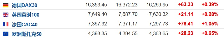 2.截至发稿,德国DAX指数涨0.39%,英国富时100指数涨0.28%,法国CAC40指数涨1.05%,欧洲斯托克50指数涨0.65%。