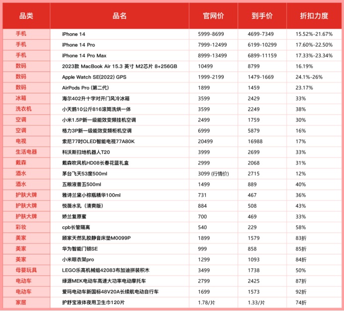 手机及数码类产品依旧是此次补贴的重点。官网价5999元起的iPhone 14,直降至4699元起,补贴力度超过15.52%;官网价7999元起的iPhone 14 Pro,直降至6199元起,补贴力度超过17.6%;官网价8999元起的iPhone 14 Pro Max,直降至6899元起,补贴力度超过17.3%;15.3 英寸2023款 MacBook Air官网价10499元,直降至8799元,补贴力度达到16.19%;官网价1999元起的Apple Watch SE(2022) GPS版,券后降至1479元起,补贴力度超过24.1%;第二代AirPods Pro官网价1899元,券后降至1459元,补贴力度达到23.17%。