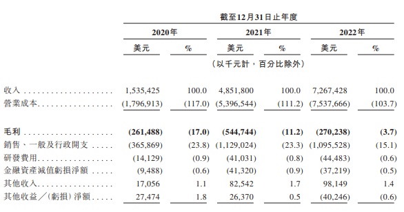 财务方面,截至2020年、2021年及2022年12月31日止年度,该公司的收入分别为约15.35亿美元、48.51亿美元、72.67亿美元,复合年增长率高达117.6%。同期,来自经营活动的毛损分别为2.62 亿美元、5.45 亿美元和 2.70 亿美元,亏损开始收窄。