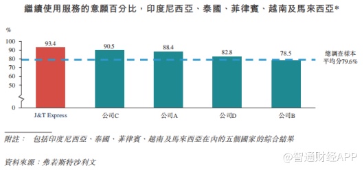 在海外市场,据弗若斯特沙利文对印尼、越南、马来西亚、菲律宾及泰国的快递市场消费者调查,就净推荐值(NPS)而言,极兔环球的平均得分为8.4分(满分10分),在速度、时效及服务质量满意度方面属同行最佳;于受访国家中,93.4%的极兔环球用户受访者表示日后将继续使用极兔环球提供的快递服务。
