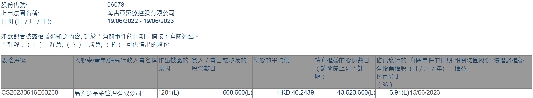 智通财经APP获悉,香港联交所最新资料显示,6月15日,易方达减持海吉亚医疗(06078)66.86万股,每股作价46.2439港元,总金额约为3091.87万港元。减持后最新持股数目为4362.06万股,最新持股比例为6.91%。