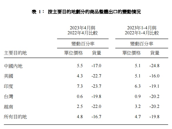 2023年4月与2022年4月比较,输往所有主要目的地的整体出口货量均录得跌幅:印度(-23.7%)、美国(-22.7%)、越南(-22.0%)、台湾(-19.8%)及中国内地(内地)(-17.0%)。
