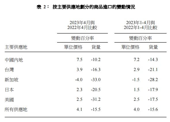 2023年4月与2022年4月比较,来自所有主要供应地的进口货量均录得跌幅:新加坡(-33.0%)、美国(-31.2%)、日本(-20.5%)、台湾(-16.3%)及内地(-10.2%)。
