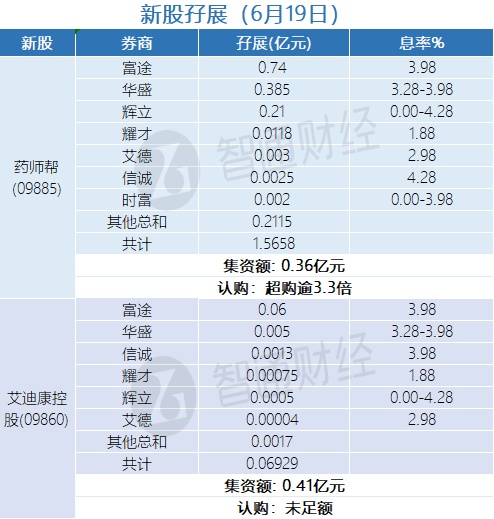 智通财经APP获悉,药师帮(09885)、艾迪康控股(09860)正在招股中。截至6月19日,富途、辉立等合计为药师帮借出孖展1.5658亿港元,超购逾3.3倍;合计为艾迪康借出孖展0.06929亿港元,认购未足额。