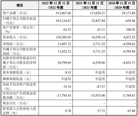财务方面,于2020年度、2021年度、2022年度、公司实现营业收入分别约为0.41亿元、1.04亿元、12.66亿元。其中,公司实现净利润分别为-4599.63万元、-5711.25万元、11897.72万元。