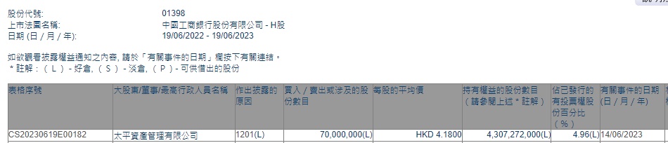 智通财经APP获悉,香港联交所最新资料显示,6月14日,太平资产管理有限公司减持工商银行(01398)7000万股,每股作价4.18港元,总金额约为2.93亿港元。减持持后最新持股数目约为43.07亿股,最新持股比例为4.96%。