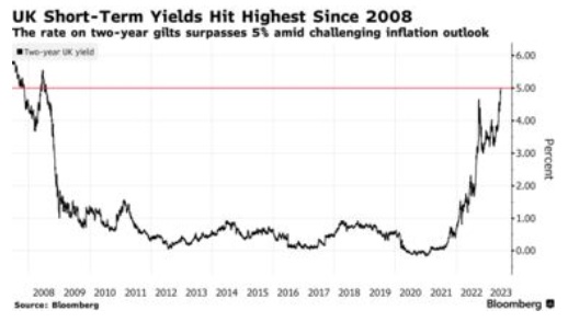 英国国债是今年表现最差的主要国债之一,两年期国债收益率上涨逾140个基点,超过了前首相特拉斯备受争议的支出计划带来的影响所触及的峰值。