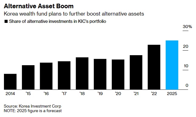 KIC的首席执行官Seoungho Jin表示,计划到2025年将25%的资产配置到私募股权和信贷、房地产和对冲基金等类别,高于去年年底的22.8%。他表示:“我们认为投资组合多样化非常重要。”他补充称,私人信贷尤其有前景,该基金计划增加在这一领域的投资。