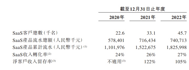 在业务增长的推动下,于往绩记录期间,公司的SaaS客户总数、SaaS流水总额及SaaS累计流水均有所增加,表明公司从不断增长的客户群的预付款项中获得了稳健的流水。于2021年及2022年,公司净客户收入留存率分别为122%和105%,表明公司于有关期间自复购客户产生的收入有所增加。随着公司客户群的增长及流水的增加,客户的预付款项随后于合同期内或于消费时在公司的收入内确认。于2020年、2021年及2022年,公司的SaaS收入转化率分别为24%、26%及27%。