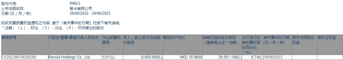 Ltd.减持移卡(09923)900万股,每股作价18.98港元,总金额约为1.71亿港元。减持后最新持股数目约为3005.12万股,最新持股比例为6.74%。