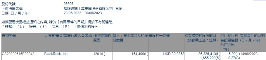 智通财经APP获悉,香港联交所最新资料显示,6月14日,贝莱德减持福耀玻璃(03606)16.44万股,每股作价30.9358港元,总金额约为508.58万港元。减持后最新持股数目约为3632.64万股,最新持股比例为5.99%。
