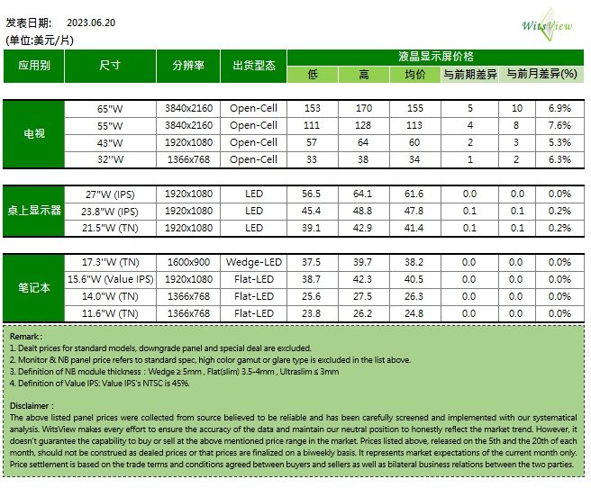 智通财经APP获悉,6月20日,根据TrendForce集邦咨询数据显示,2023年6月下旬,电视各尺寸面板价格继续上涨,部分显示器面板价格小幅上调,笔记本面板产品继续维持不变。