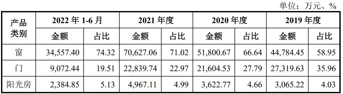 皇派家居产品主要包括窗、门、阳光房,主要应用于个人家装的零售类消费市场。报告期内,窗、门以及阳光房合计占主营业务收入的比例分别为98.95%、99.09%、98.98%和98.97%,具体情况如下: