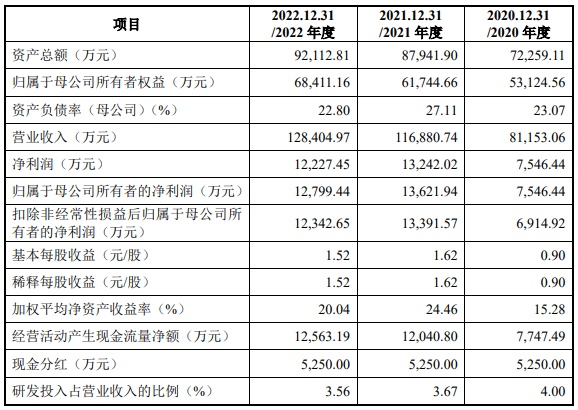 财务方面,于2020年、2021年、2022年,该公司实现营业收入分别约为8.12亿元、11.69亿元、12.84亿元;净利润分别约为7546.44万元、1.32亿元、1.22亿元。