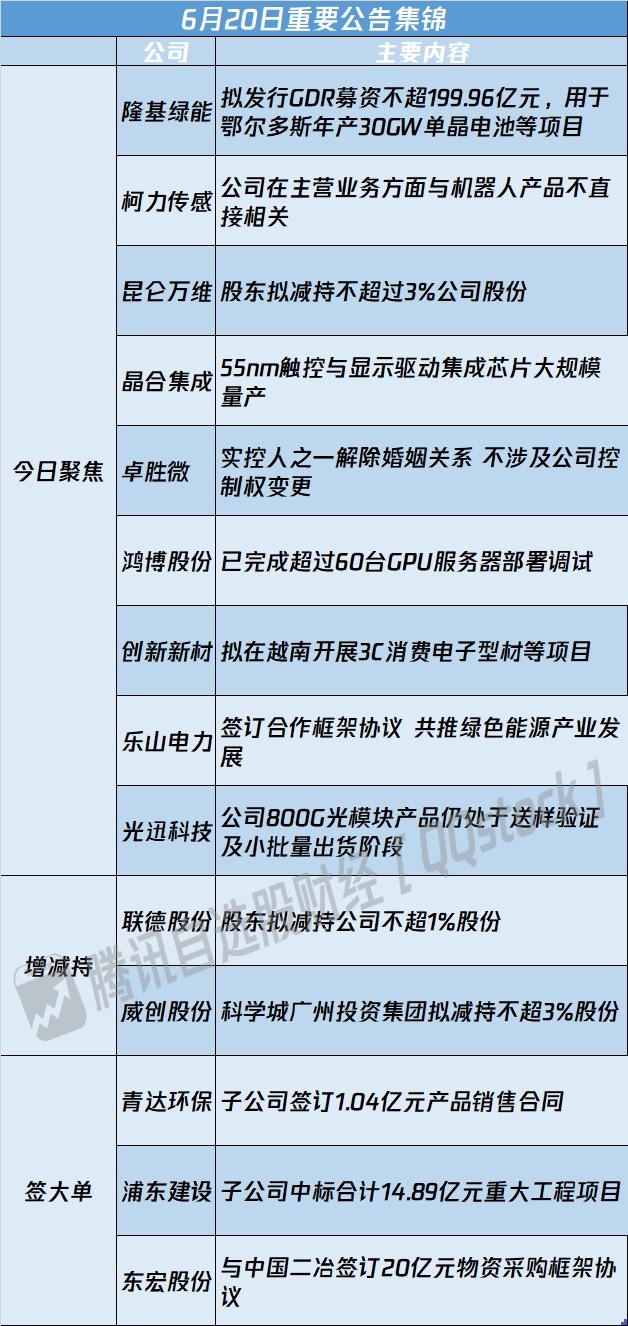 1、隆基绿能:拟发行GDR募资不超199.96亿元,用于鄂尔多斯年产30GW单晶电池等项目