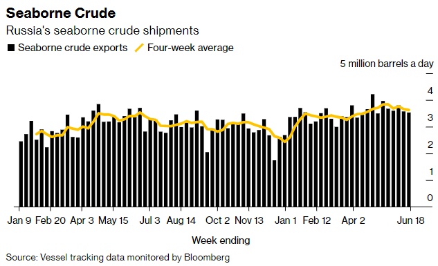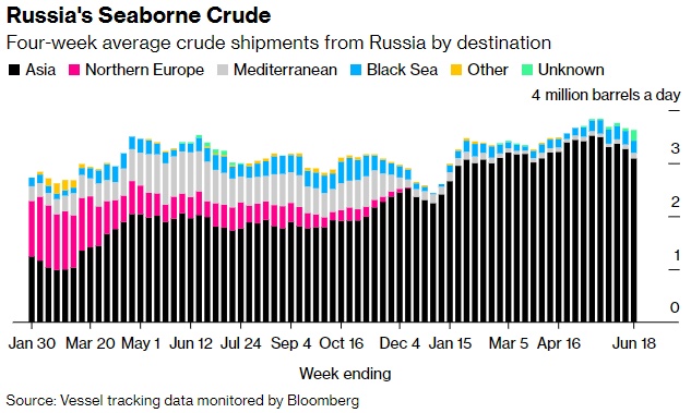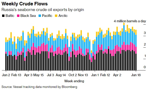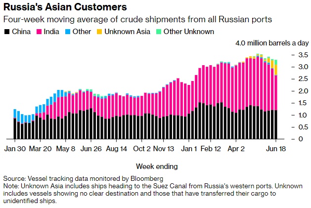 截至6月18日,俄罗斯亚洲客户的四周平均出货量,加上没有最终目的地的船只,从截至6月11日的四周平均每天332万桶略微下降至329万桶。