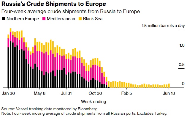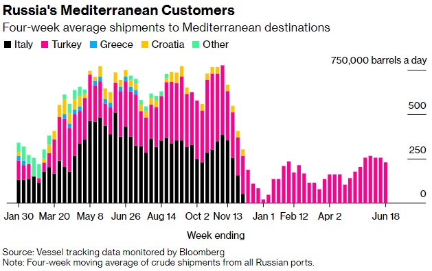 在截至6月18日的四周内,俄罗斯对土耳其(俄罗斯仅存的地中海客户)的出口量小幅降至23万桶/日,而此前四周的平均出口量为26万桶/日;去年10月,流入该国的石油日产量已超过42.5万桶。