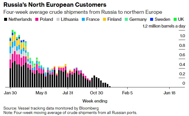 从波罗的海、黑海和北极的出口码头,每天消耗约150万桶短途海运原油的市场已经几乎完全消失,取而代之的是亚洲的长途目的地,后者的运输成本和时间都要高得多。