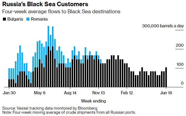 在截至6月18日的28天内,俄罗斯对欧洲国家的海运原油出口量小幅上升至每天10.4万桶,保加利亚是唯一的目的地。这些数字不包括运往土耳其的货物。