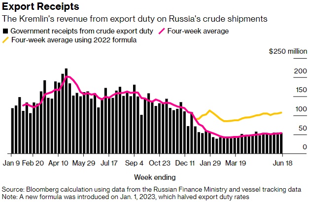 在截至6月18日的7天里,从原油出口关税中流入俄罗斯政府的资金保持在5500万美元不变。四周的平均收入增加了100万美元,达到5400万美元。