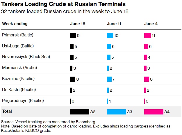 船舶跟踪数据和港口代理报告显示,在截至6月18日的一周内,共有32艘油轮装载了2470万桶俄罗斯原油。这比前一周的数字减少了28万桶,是六周以来的最小数量。目的地是基于船只在撰写本文时发出的航向信号,其中一些几乎肯定会随着航行的进行而改变。所有数据均不包括哈萨克斯坦KEBCO等级的货物。