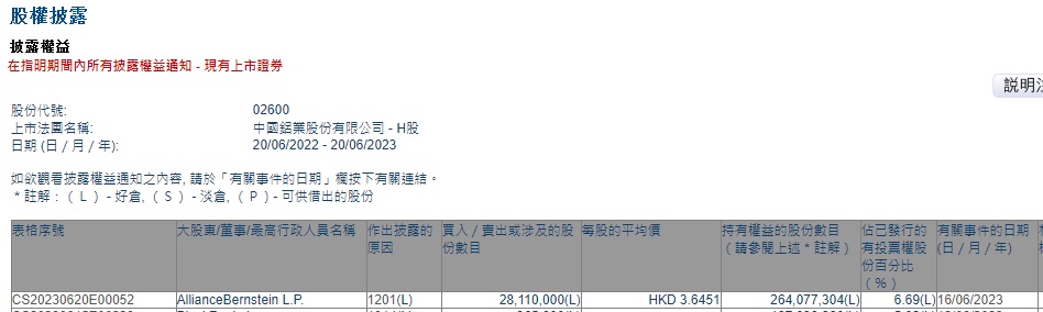 L.P.减持中国铝业(02600)2811万股,每股作价3.6451港元,总金额约1.02亿港元。减持后最新持股数目约为2.64亿股,最新持股比例为6.69%。