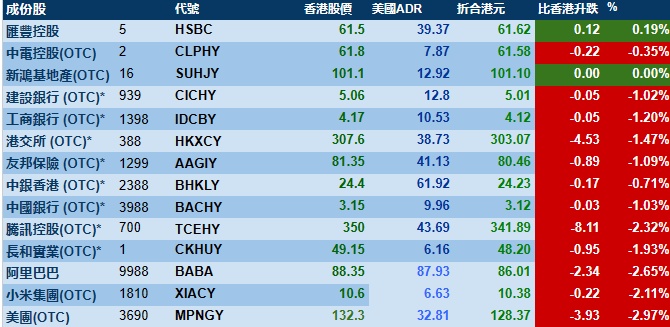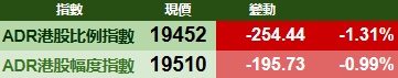智通财经APP获悉,周二,美股三大指数集体收跌,港股ADR指数下跌,按比例计算,收报19452点,较香港收市跌254.44点或1.31%。