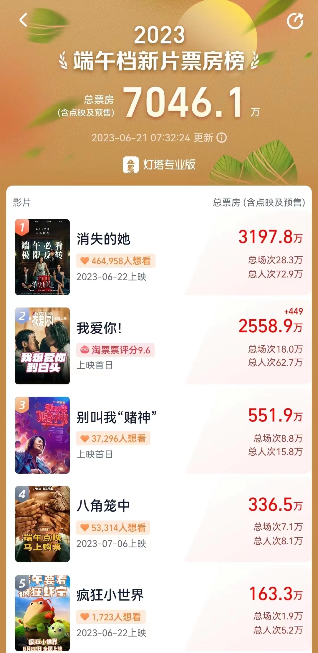 智通财经APP获悉,据灯塔专业版实时数据,截至6月21日7时32分,2023年端午档新片预售总票房达到7046.1万元,共计有15部影片将在端午档展开竞争。其中,《消失的她》、《我爱你!》、《别叫我“赌神”》分列票房预售榜前三位。截止发稿,《消失的她》预售票房已逼近3200万元,打破过去三年端午档影片预售票房纪录。业内对《消失的她》寄予厚望,映前媒体票房预测,该电影最终票房在7.5亿元至9.8亿元区间。