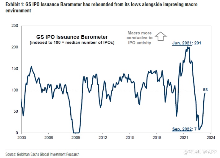 美联储激进的紧缩政策让IPO市场陷入萎缩。高盛认为美国经济可以实现软着陆。如果是这样的话,衡量IPO环境的指标将在2023年下半年达到119。